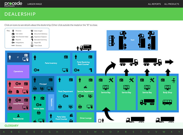 Creating the Site. The microsite needed to be integrated within their company information portal. The home page is a top down layout of a typical truck dealership with different departments. In each department there are links that pop up various models on terms, user personas, products and reports that relate to that department. The image is one big HTML Image Map. I wanted to use an SVG that easily scales, but found that SVGs break down when they get too many links embedded in them. So I switched to the image map. I also found a few great jQuery tools. One is Colorbox that I use to create modals. It works pretty good.
